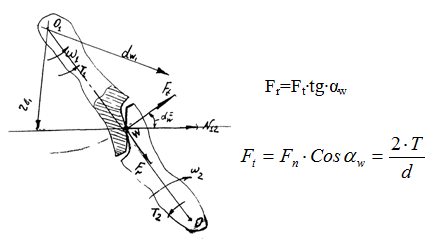 Силы взаимодействия между зубьями принято определять в полюсе зацепления. Распределенную по контактной линии нагрузку в зацеплении заменяют равнодействующей Fn, которая направлена по линии зацепления. Силами трения пренебрегают, т.к. они малы.