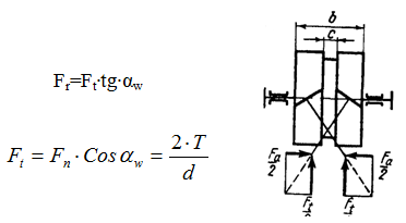 - в цилиндрических прямозубых (рисунок 28а) и шевронных (рисунок 28б) передачах на окружную силу Ft и радиальную силу Fr;