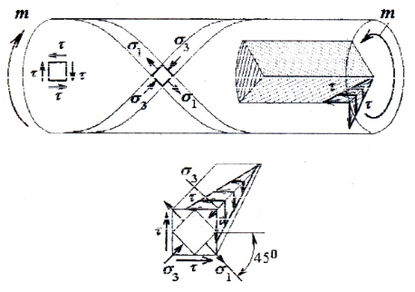 При кручении, наряду с касательными напряжениями в поперечных сечениях, в соответствии с законом парности, касательные напряжения возникают и в продольных сечениях. Таким образом, во всех точках вала имеет место чистый сдвиг.