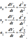 где ax , ay , az — проекции ускорения точки на декартовы оси координат;
